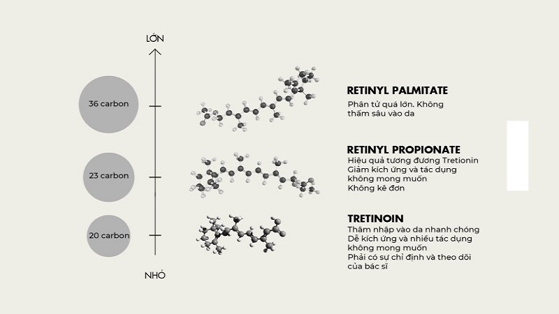 B. So sánh Retinol và Retinyl Palmitate về kích thước phân tử và khả năng thẩm thấu vào da